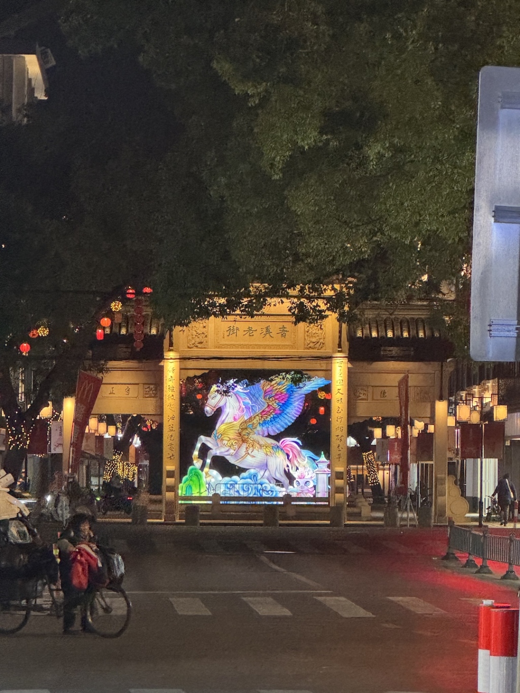 这个春节,与带翼天马共赴一场千年之约。当新春的灯火点亮青溪老街的夜晚,一匹羽翼华美的天马,从古典楼阁的飞檐间翩然跃起。它身披绚烂流光, 穿过缭绕 的祥云,向着天际的圆月翱翔而去。 这一刻,古建筑的雅致、祥云的空灵与月色的浪漫交织成画, 仿佛打开了一个梦幻的仙境之内。