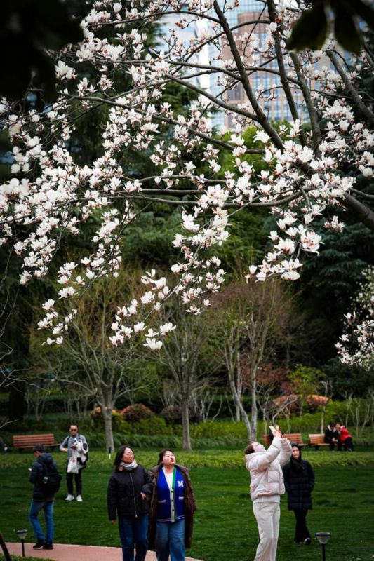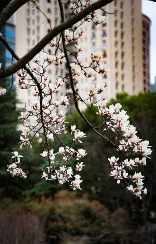 微风拂过,花瓣轻轻颤动,偶尔飘落几片,落在青草地里,像撒了一地温柔。背景是林立的现代建筑,冷调楼宇遇上柔白玉兰,刚柔相济,自成上海街头独有的春日意境。