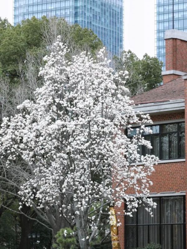 近日,延安绿地那株6米高的“玉兰皇后”静静立在草坪中央,满树千朵洁白的玉兰花次第舒展,在楼宇之间撑起一片温柔的白。