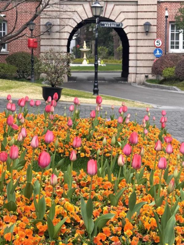 顺着平整的草坪向前漫步,不远处的郁金香正迎着春光热烈盛放。粉的温婉、红的热烈、橙的明媚,一排排、一簇簇依偎在草坪边缘,如同大自然打翻的调色盘,将最鲜活的春色尽数铺展。修长挺拔的花茎托起圆润饱满的花杯,在春风里轻轻摇曳,与复古拱门、茵茵绿草、百年老建筑相映成趣,勾勒出英式庄园独有的优雅与浪漫。
