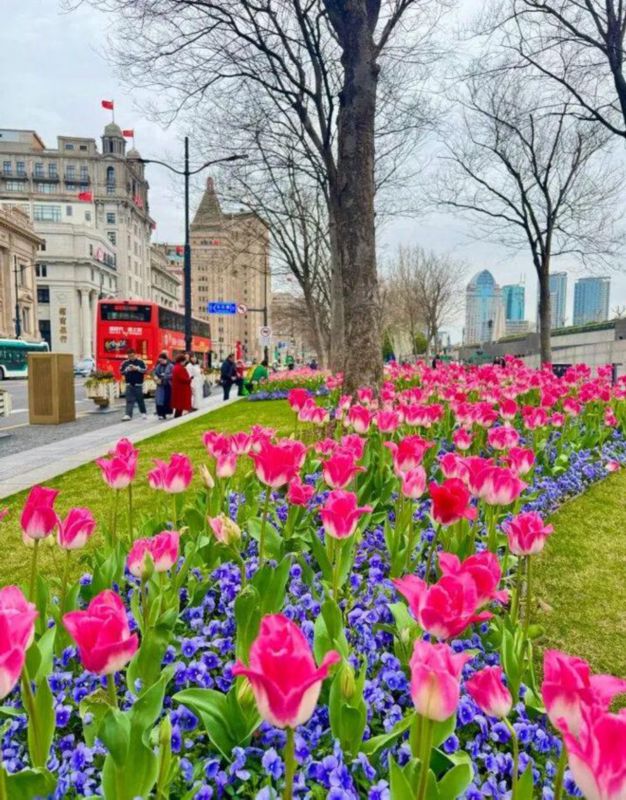 外滩的郁金香浪漫也即将上线,从九江路去外滩,一路向南到延安东路都是郁金香,各种颜色间错分布,一路上都是盎然的春意。