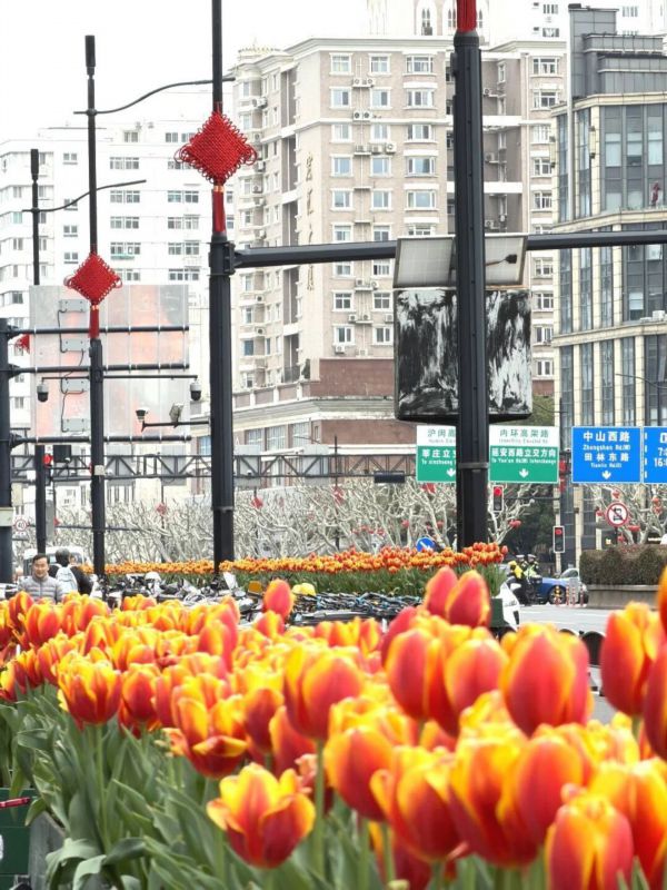 作为春日里的“调色盘”,郁金香已成为徐汇街头最亮眼的风景线。目前,第一批郁金香已在徐家汇商圈、漕溪北路、虹桥路沿线等核心点位盛开。橙红如霞的哈尼、火红热烈的世界火、粉柔娇俏的独步舞等品种错落交织,连绵成流动的花廊。车流行人穿梭其间,城市仿佛被装进了春天的调色盘,灵动而温暖。