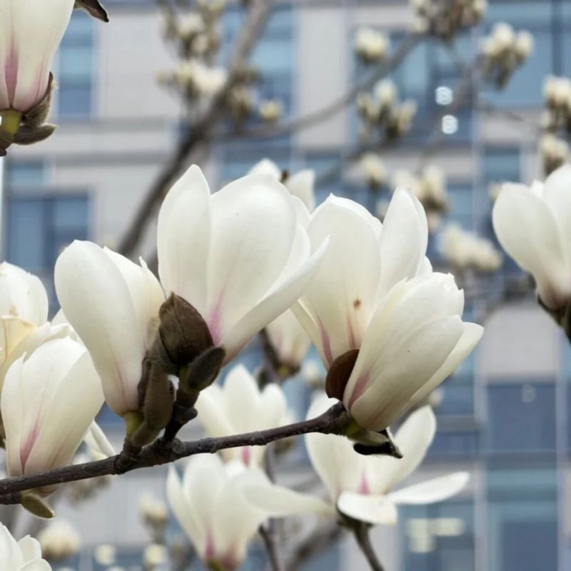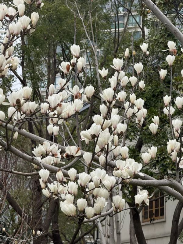 作为上海市花,白玉兰承载着这座城市的精神气质。上影广场绿地的白玉兰已亭亭舒展,洁白花瓣在枝头傲然绽放,与周边的海派建筑相映成趣——一者是自然的清雅,一者是人文的大气,恰是徐汇独有的春日对话。