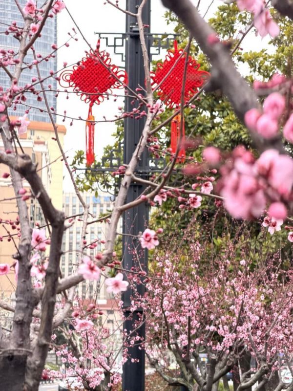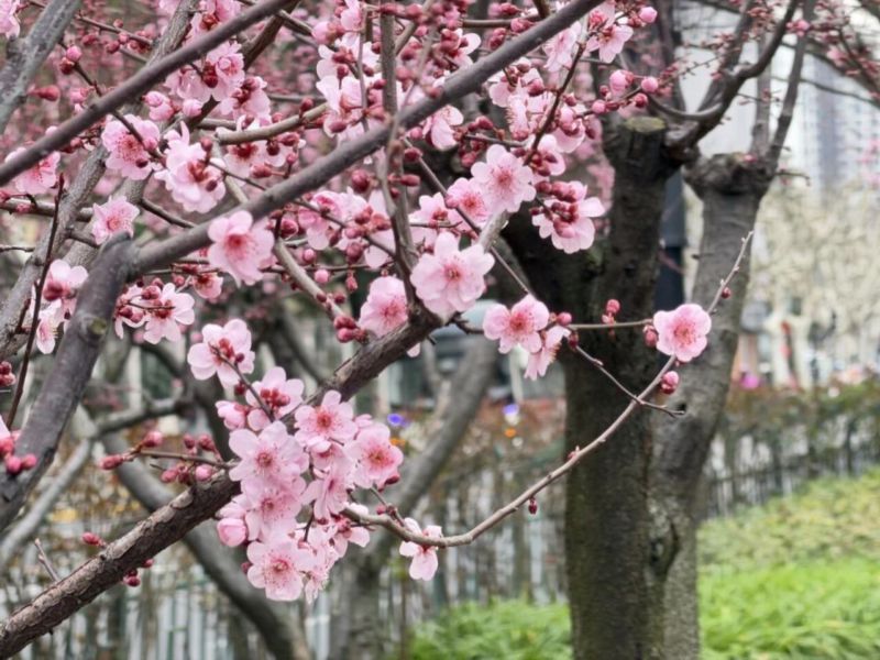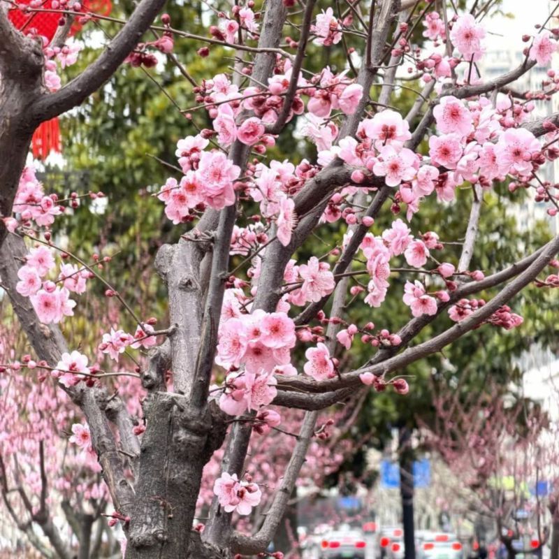 烂漫的美人梅也已进入最佳观赏期。虹桥路与凯旋南路沿线,层层叠叠的粉瓣缀满枝头,如云霞般柔美。当美人梅的粉艳与郁金香的缤纷相遇,徐汇的早春便有了最温柔的注脚。