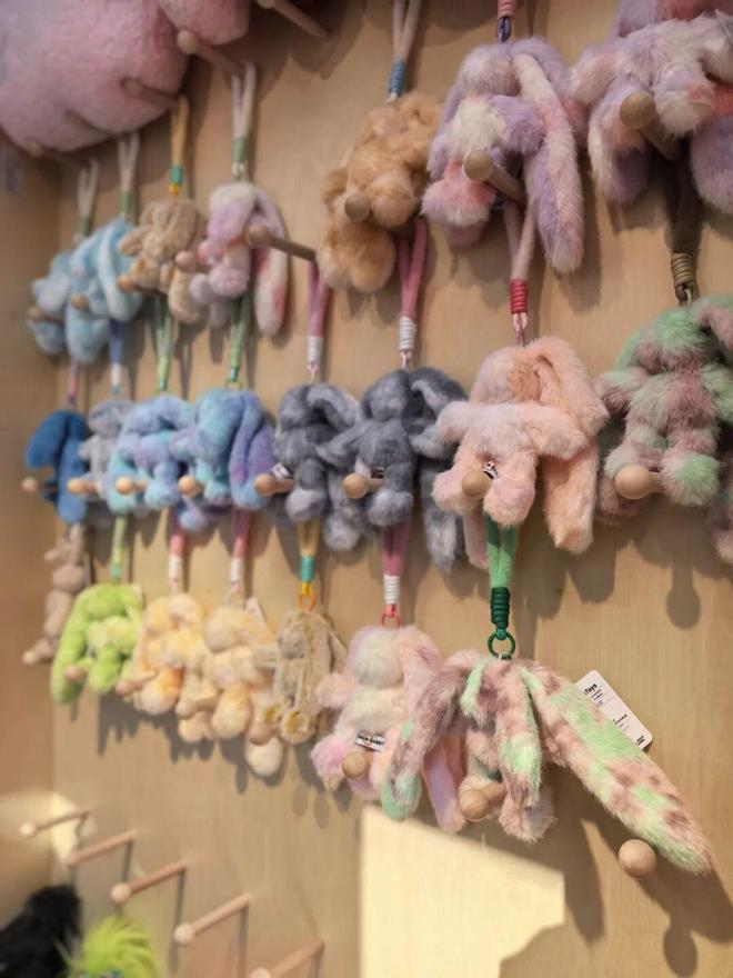 暖橙色的“车厢”内,数十款色彩艳丽、细节丰富的IP毛绒挂件整齐排列,其设计概念来自中国敦煌莫高窟藻井壁画“三兔共耳”。“敦煌元素和萌系风格的设计很有意义,就像把一份祝福带在身边。”带着孩子前来的何先生毫不犹豫地为女儿挑选了一只蓝色三耳兔。